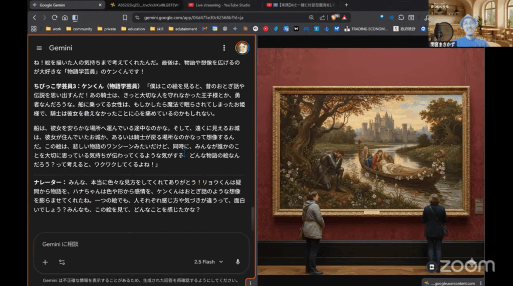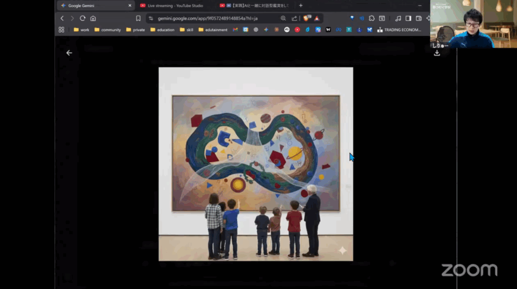 夢つむぐ学校の運営メンバー2人が、AIツール「Google Gemini」で生成したアート作品を見ながら、その場で感じたことを語り合う“リアルな対話型鑑賞”をライブで実践しました。